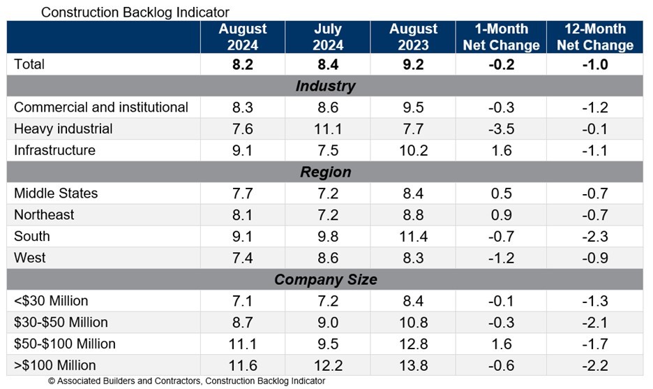 Associated Builders and Contractors has reported that its Construction Backlog Indicator fell to 8.2 months in August, according to an ABC member survey conducted Aug. 20 to Sept. 5. The reading is down 1.0 months from August 2023.