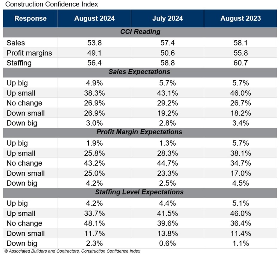 ABC’s Construction Confidence Index readings for sales, profit margins and staffing levels fell in August. The readings for sales and staffing levels remain above the threshold of 50, indicating expectations for growth over the next six months, while the reading for profit margin expectations fell below that threshold.