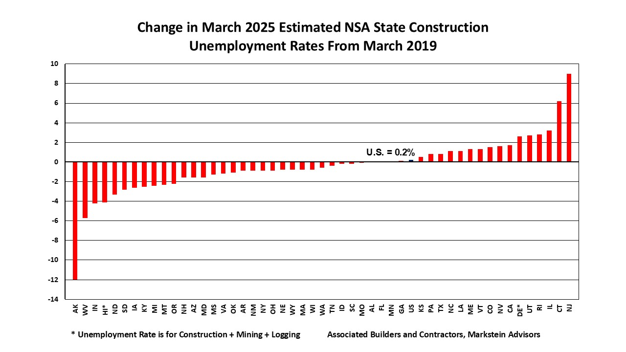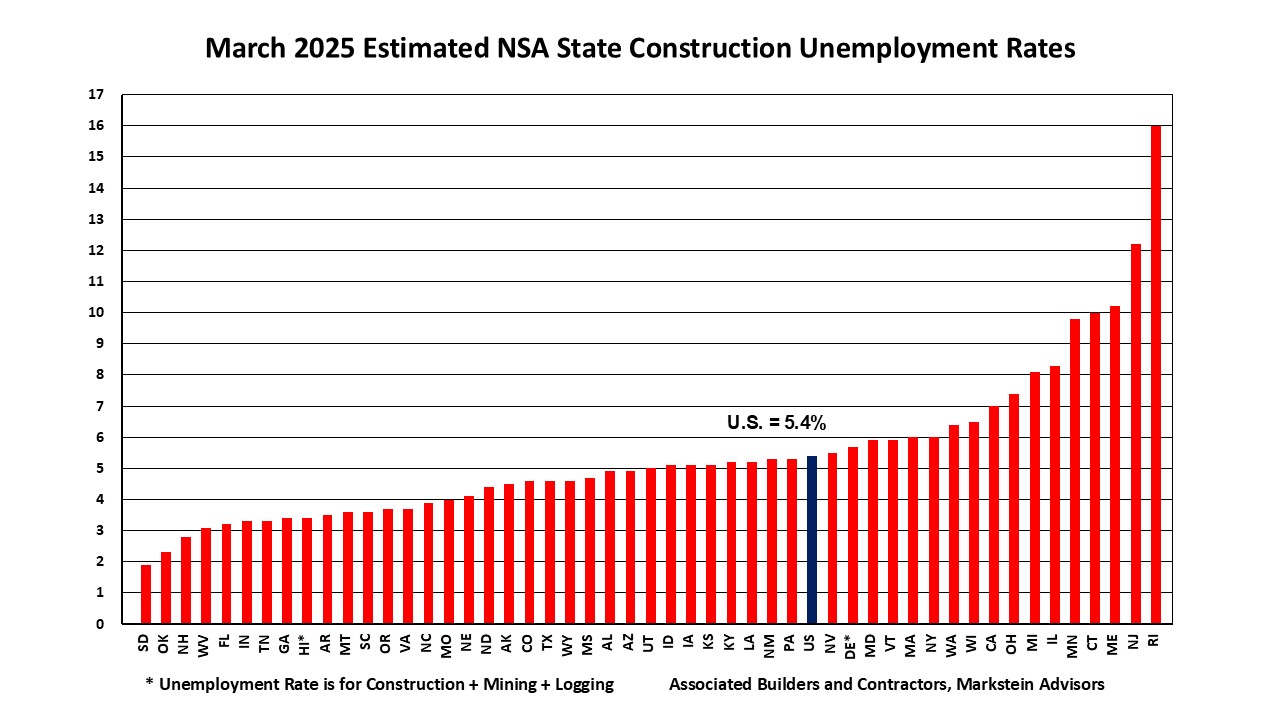 The national March 2025 not seasonally adjusted construction unemployment rate was 5.4%, unchanged from March 2024, according to a state-by-state analysis of U.S. Bureau of Labor Statistics data released by Associated Builders and Contractors. The analysis found that 19 states had lower estimated construction unemployment rates over the same period, 25 had higher rates and six states had the same rates. All states except for Connecticut, Maine, New Jersey and Rhode Island had construction unemployment rates below 10%.