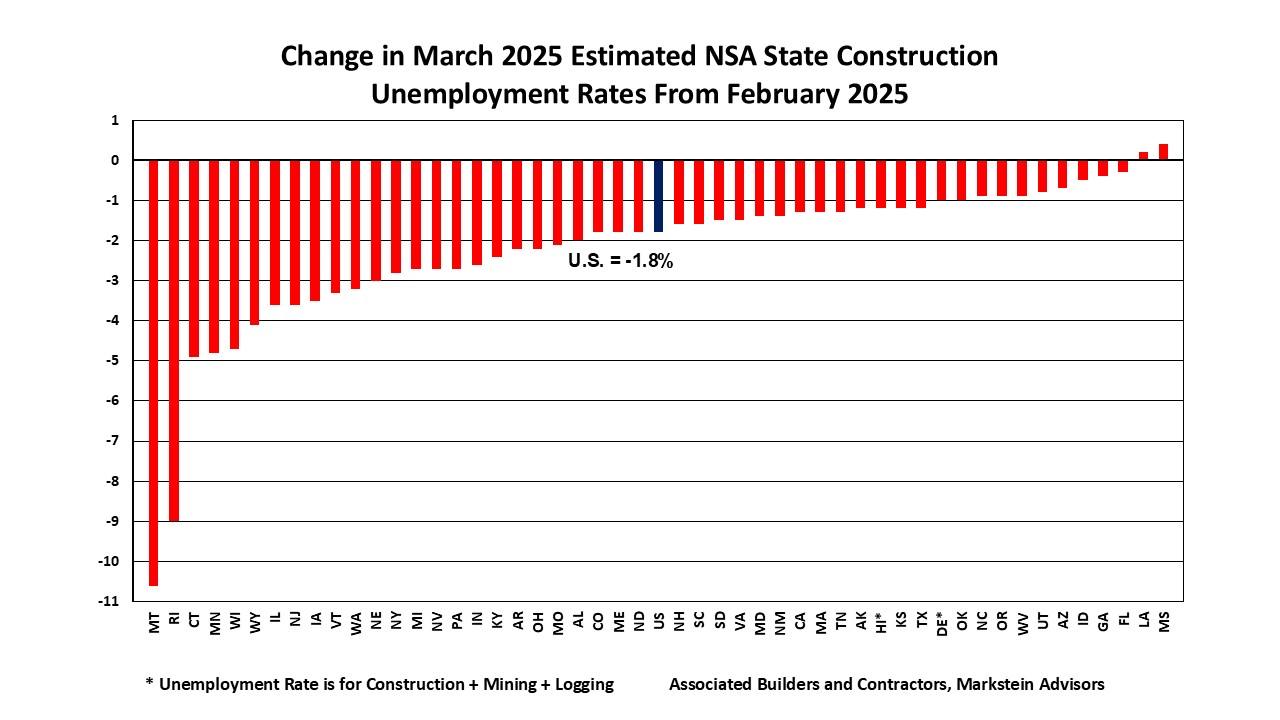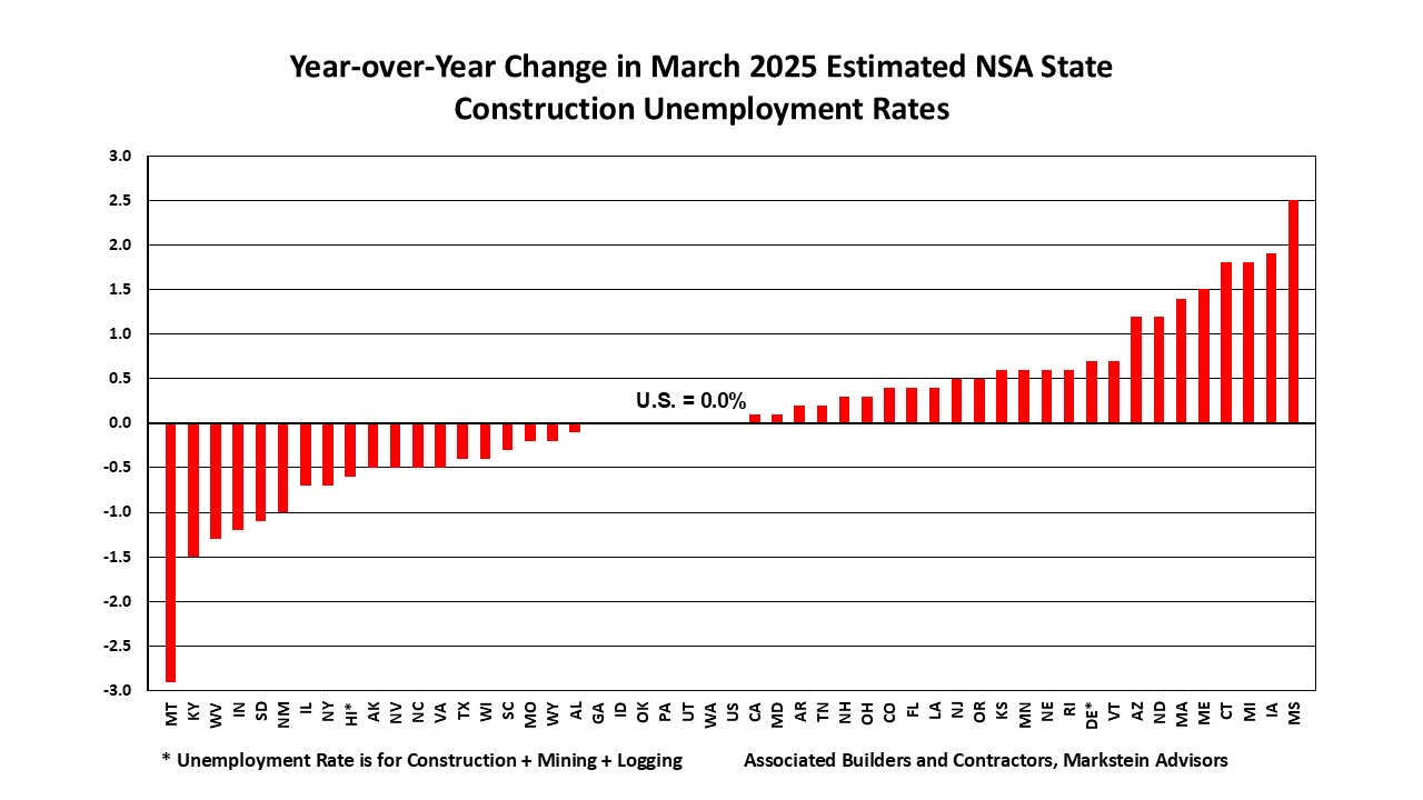 “Although March state construction unemployment rates show a relatively healthy level of construction employment, rising uncertainty about the business climate over the remainder of this year and 2026 is weighing on contractor and developer plans,” said Bernard Markstein, president and chief economist of Markstein Advisors, who conducted the analysis for ABC. “Confusion surrounding tariffs and their impact on building materials prices has increased the level of uncertainty. This is on top of continued elevated interest rates and higher labor costs. These concerns are stoking fears of a major economic slowdown and the possibility of a recession. For now, most of the construction industry is slowing or temporarily halting hiring workers as they seek greater clarity as to where the economy is headed.”