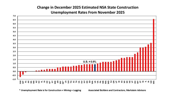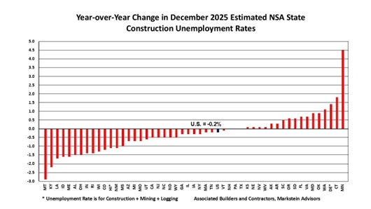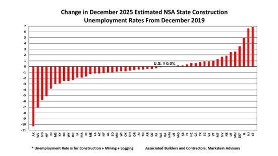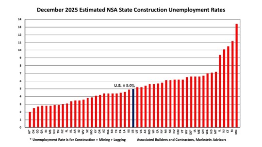 The national December 2025 not seasonally adjusted construction unemployment rate was 5.0%, a 0.2% decrease from December 2024, according to a state-by-state analysis of U.S. Bureau of Labor Statistics data conducted by Associated Builders and Contractors. The analysis found that 60% of states (30) had lower estimated construction unemployment rates over the same period, 17 had higher rates and three states (New Hampshire, Pennsylvania and Texas) had the same rate. All but five states had construction unemployment rates below 8%.