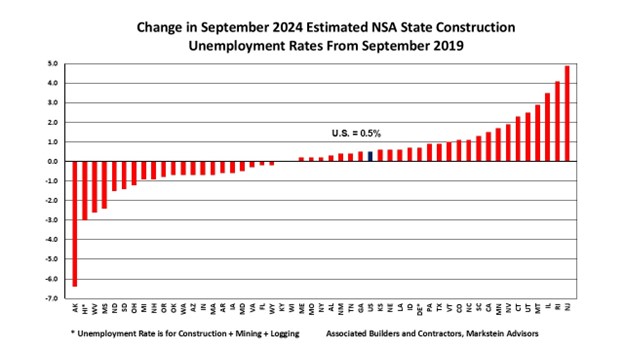 WASHINGTON, Nov. 4—The national September 2024 not seasonally adjusted construction unemployment rate was 3.7%, down 0.1% from the previous year, according to Associated Builders and Contractors’ state-by-state analysis of U.S. Bureau of Labor Statistics data. The analysis also found that 24 states had lower construction unemployment rates over the same period, four states were unchanged and 22 states were higher.