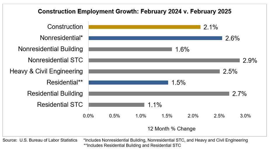 The construction industry added 19,000 jobs on net in February, according to an Associated Builders and Contractors analysis of U.S. Bureau of Labor Statistics data. On a year-over-year basis, industry employment has increased by 174,000 jobs, an increase of 2.1%.