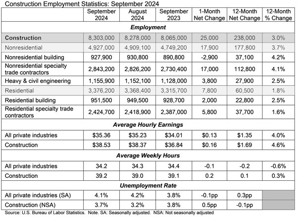The construction industry added 25,000 jobs on net in September, according to an Associated Builders and Contractors analysis of U.S. Bureau of Labor Statistics data. On a year-over-year basis, industry employment is up by 238,000 jobs, an increase of 3.0%.