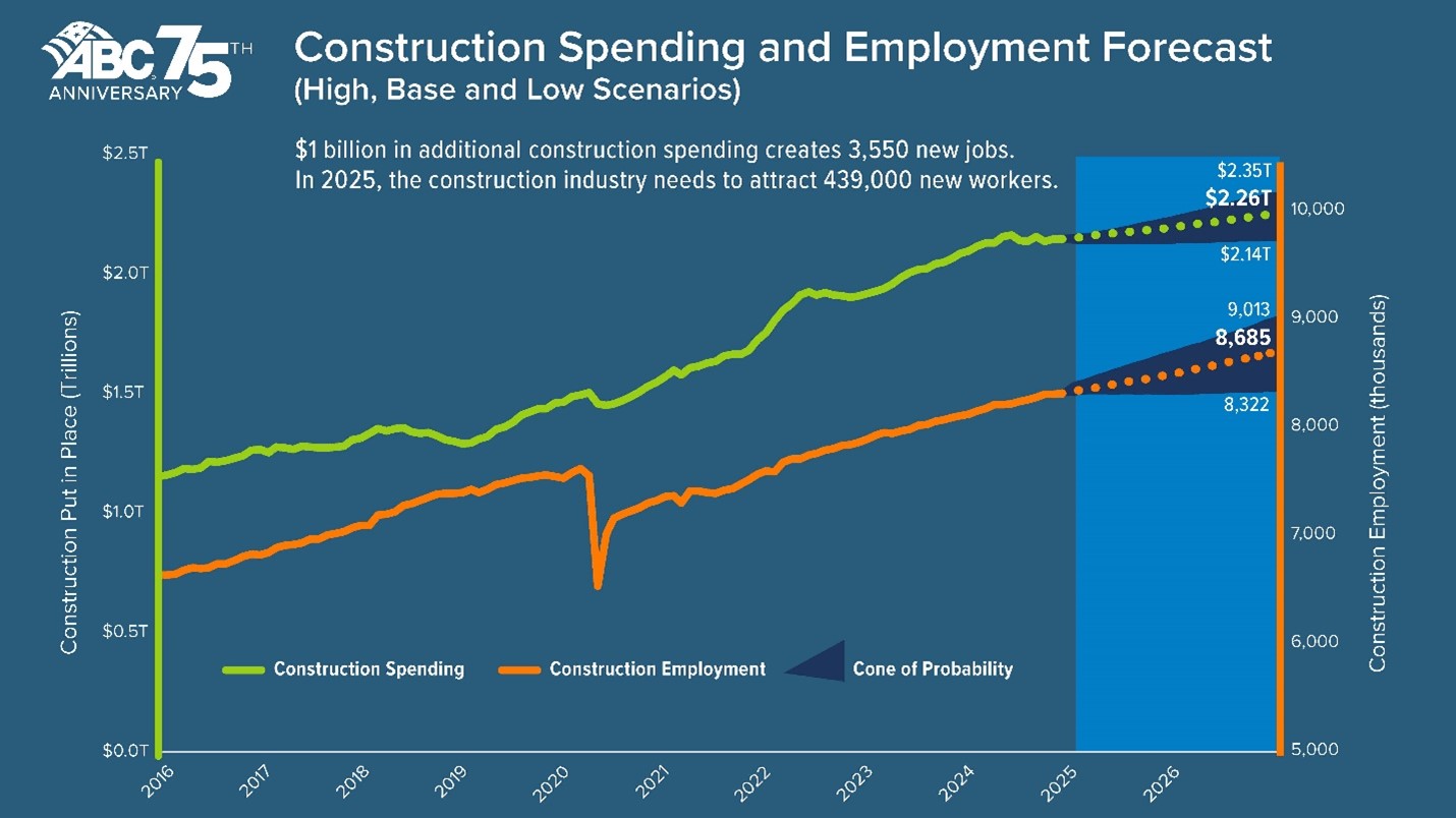 The construction industry will need to attract an estimated 439,000 net new workers in 2025 to meet anticipated demand for construction services, according to a proprietary model developed and released today by Associated Builders and Contractors. In 2026, the industry will need to bring in 499,000 new workers as spending picks up in response to presumed lower interest rates.