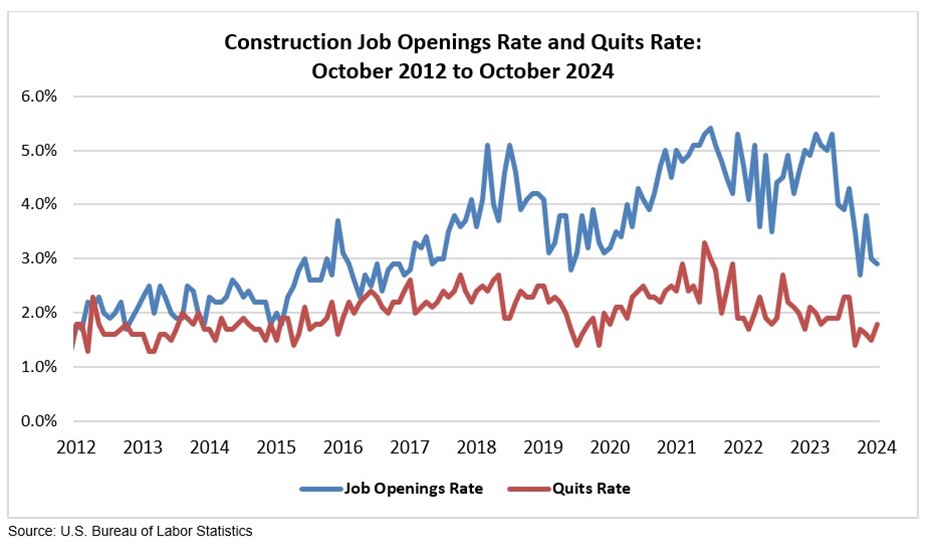 “Construction industry job openings fell again in October and are down nearly 40% over the past year,” said ABC Chief Economist Anirban Basu. “While JOLTS data can be volatile from month to month, especially at the industry level, the decline in unfilled construction positions is undeniable over the past few quarters. On average, just 3.4% of industrywide positions were open over the past six months, the lowest rate since 2020.