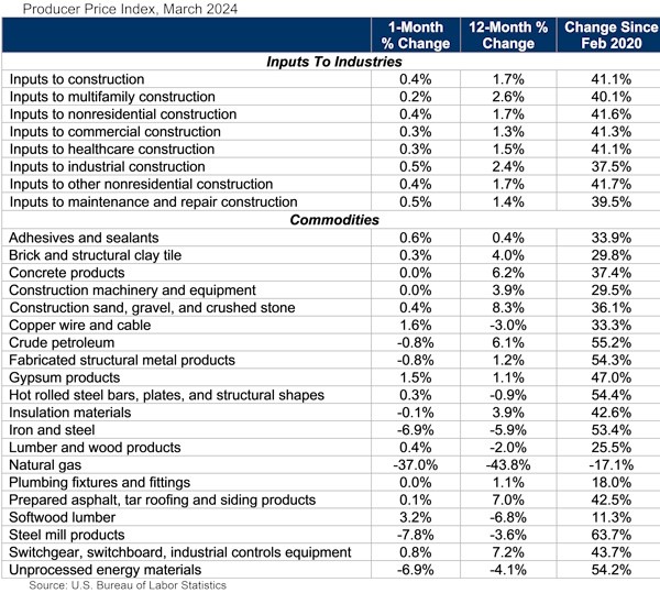 Construction input prices increased 0.4% in March compared to the previous month, according to an Associated Builders and Contractors analysis of the U.S. Bureau of Labor Statistics’ Producer Price Index data. Nonresidential construction input prices also increased 0.4% for the month.