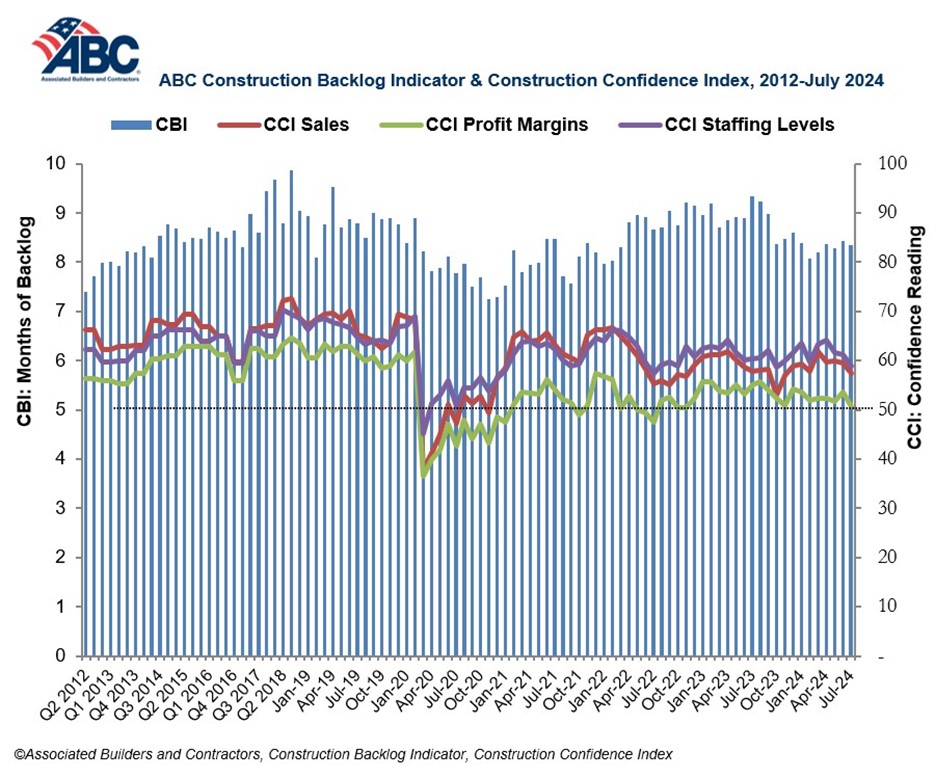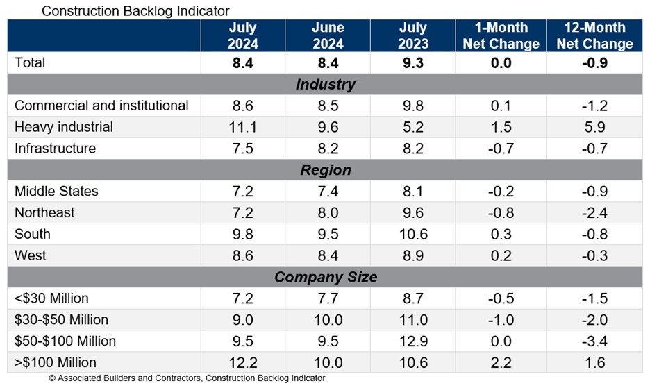 Associated Builders and Contractors reports that its Construction Backlog Indicator held steady at 8.4 months in July, according to an ABC member survey conducted July 22 to Aug. 6. The reading is down 0.9 months from July 2023.