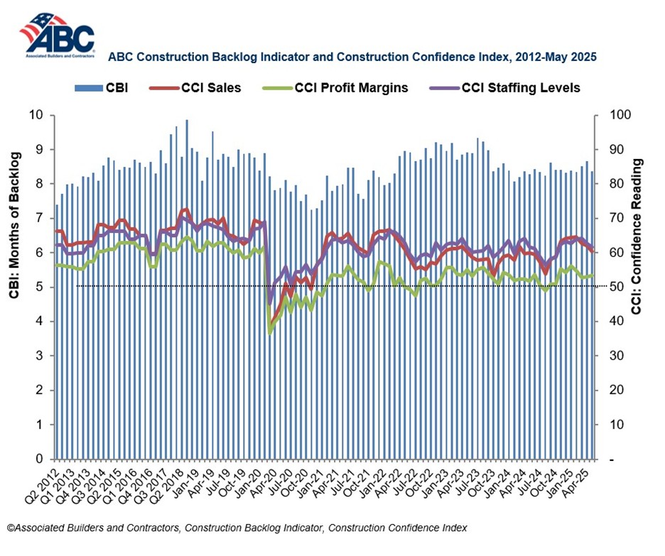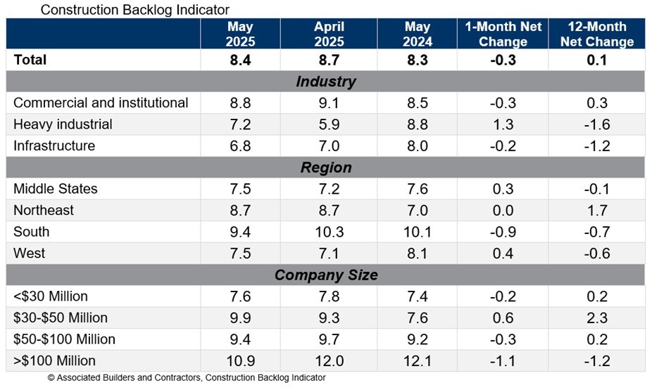 Associated Builders and Contractors reported that its Construction Backlog Indicator fell to 8.4 months in May, according to an ABC member survey conducted May 20 to June 3. The reading is up 0.1 months since May 2024.