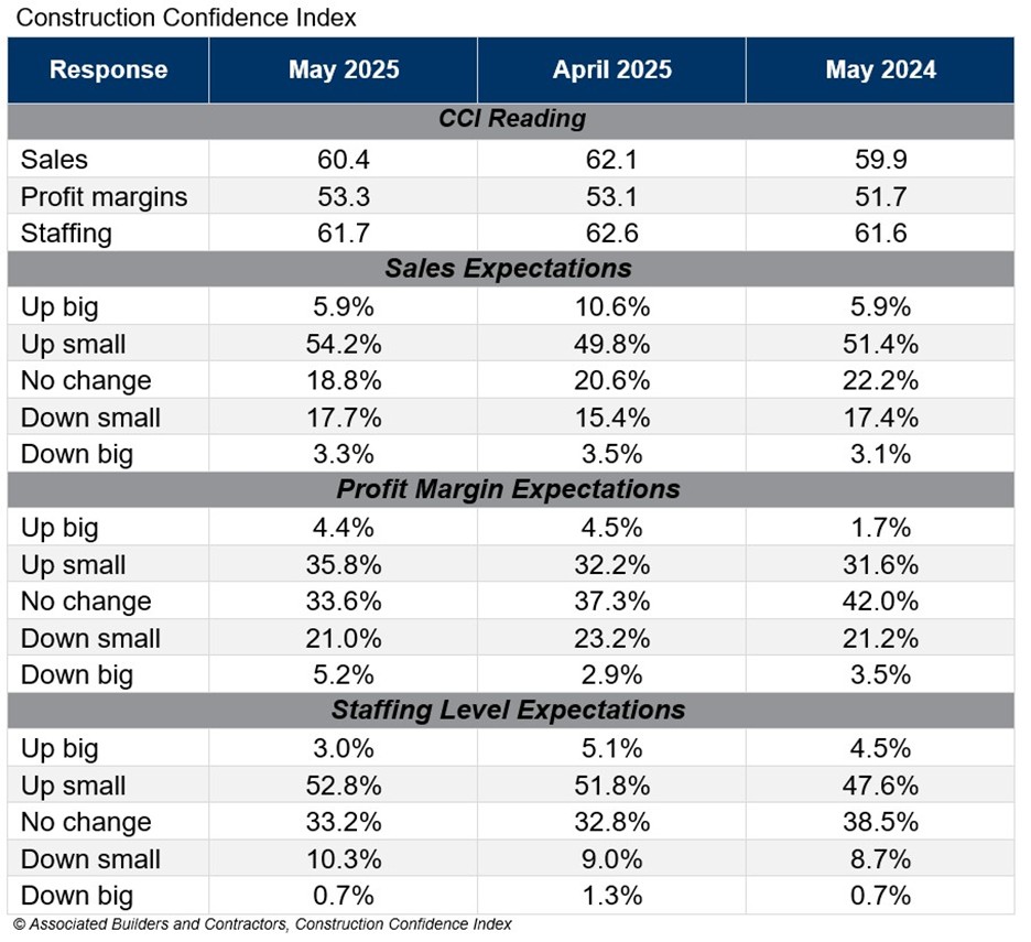 “The impacts of tariffs are increasingly apparent, with nearly 1 in 4 ABC member contractors reporting tariff-related project cancellations or delays in May,” said ABC Chief Economist Anirban Basu. “While 87% of survey respondents have been notified of tariff-related materials price increases, profit margin expectations actually improved in May.