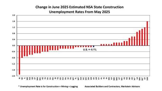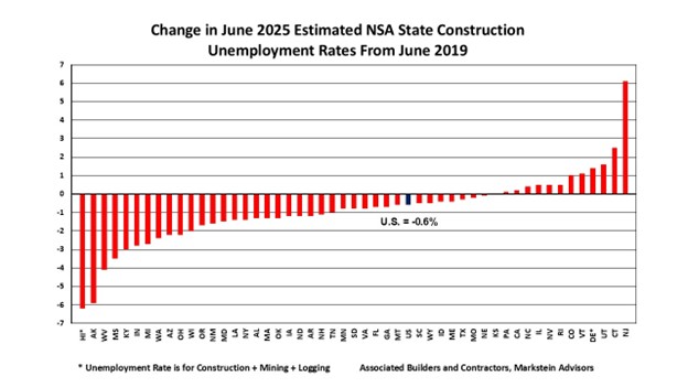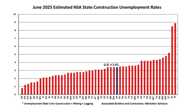 “While June state construction unemployment rates continue to indicate a relatively healthy level of construction employment, uneasiness that the economy might weaken over the remainder of this year and into 2026 is producing some hesitancy among builders and developers about proceeding with new projects,” said Bernard Markstein, president and chief economist of Markstein Advisors, who conducted the analysis for ABC.