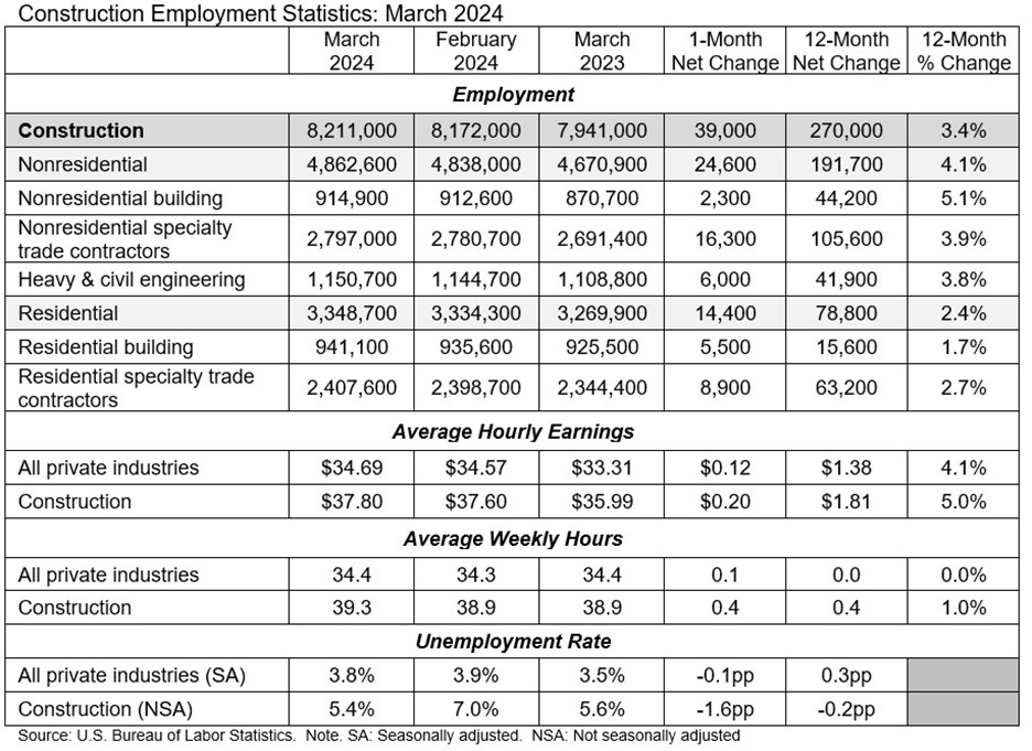 The construction industry added 39,000 jobs on net in March, according to an Associated Builders and Contractors analysis of U.S. Bureau of Labor Statistics data. On a year-over-year basis, industry employment has expanded by 270,000 jobs, an increase of 3.4%.