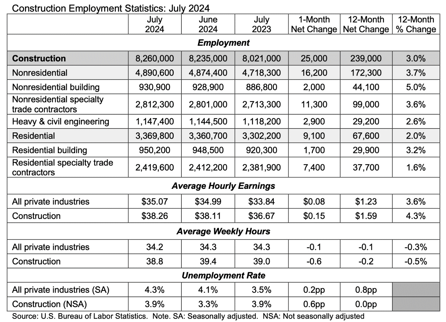 The construction industry added 25,000 jobs on net in July, according to an Associated Builders and Contractors analysis of U.S. Bureau of Labor Statistics data. On a year-over-year basis, industry employment has expanded by 239,000 jobs, an increase of 3%.