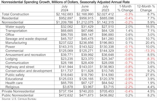 Spending was down on a monthly basis in 11 of the 16 nonresidential subcategories. Private nonresidential spending decreased 0.4%, while public nonresidential construction spending was up 0.2% in July.