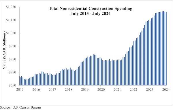 National nonresidential construction spending decreased 0.2% in July, according to an Associated Builders and Contractors analysis of U.S. Census Bureau data. On a seasonally adjusted annualized basis, nonresidential spending totaled $1.21 trillion.