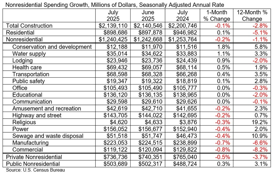 “Private nonresidential activity has declined at a particularly concerning pace over the past several months and fell another 0.5% in July,” said Basu. “With the exception of the religious category, which represents less than 1% of private nonresidential construction activity, and the power category, which is surging due to data centers and their considerable energy needs, no private subsegment has retained momentum through the first half of 2025.