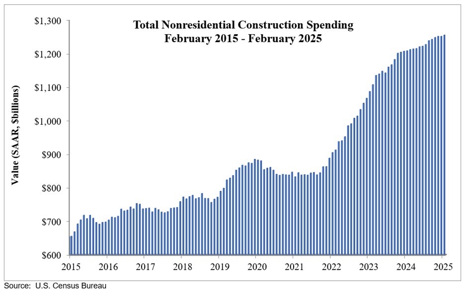 National nonresidential construction spending increased 0.3% in February, according to an Associated Builders and Contractors analysis of U.S. Census Bureau data. On a seasonally adjusted annualized basis, nonresidential spending totaled $1.255 trillion.