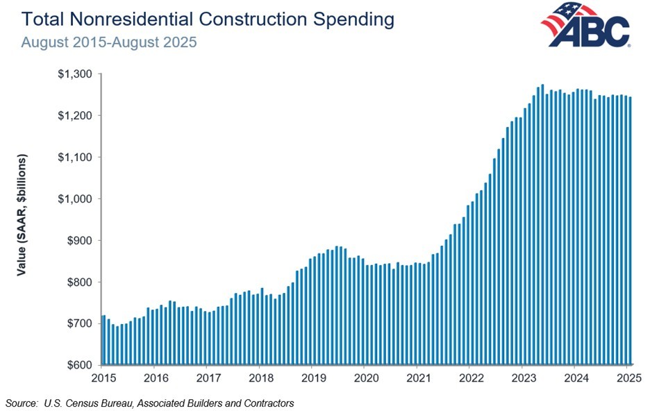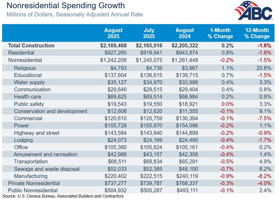 “Nonresidential construction spending contracted for the third time in the past four months in August and is now down 1.5% year over year,” said ABC Chief Economist Anirban Basu. “The manufacturing and commercial categories have been particularly weak in 2025, while momentum remains confined almost exclusively to the data center segment. This should come as no surprise given that approximately 1 in 7 ABC members are under contract to work on a data center, and those contractors have significantly higher backlog than those that are not, according to ABC’s Construction Backlog Indicator survey.
