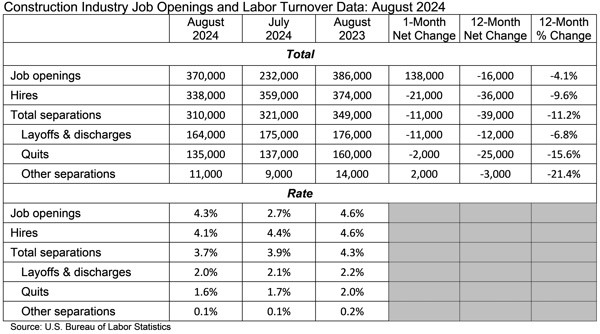 The construction industry had 370,000 job openings on the last day of August, according to an Associated Builders and Contractors analysis of data from the U.S. Bureau of Labor Statistics’ Job Openings and Labor Turnover Survey. JOLTS defines a job opening as any unfilled position for which an employer is actively recruiting.