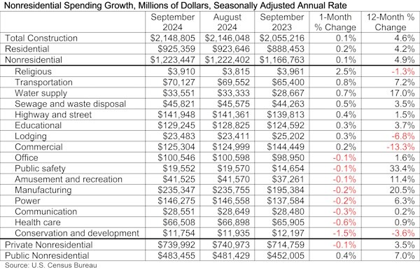 National nonresidential construction spending increased 0.1% in September, according to an Associated Builders and Contractors analysis of U.S. Census Bureau data. On a seasonally adjusted annualized basis, nonresidential spending totaled $1.22 trillion.