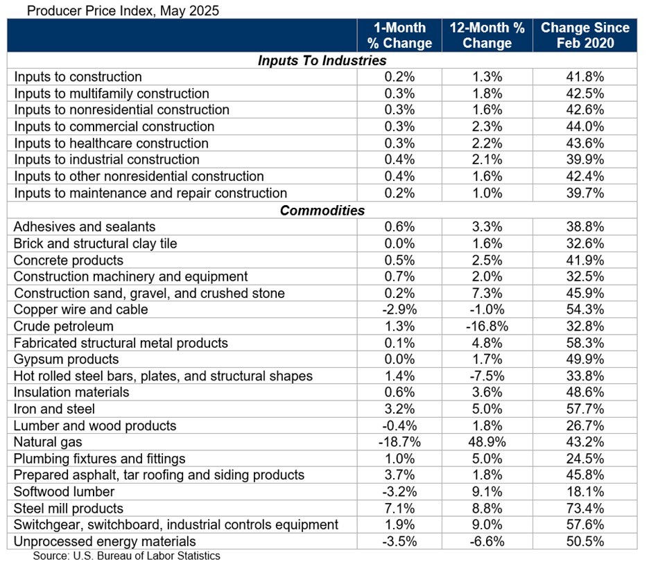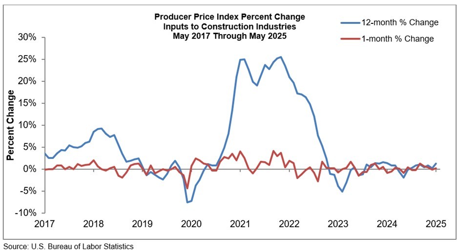 “Construction materials prices continued to increase at a faster-than-ideal pace in May,” said ABC Chief Economist Anirban Basu. “While input prices are up just 1.3% over the past year, that modest escalation is entirely due to price decreases during the second half of 2024. Costs have increased rapidly since the start of this year, with input prices rising at a 6% annualized rate through the first five months of 2025.