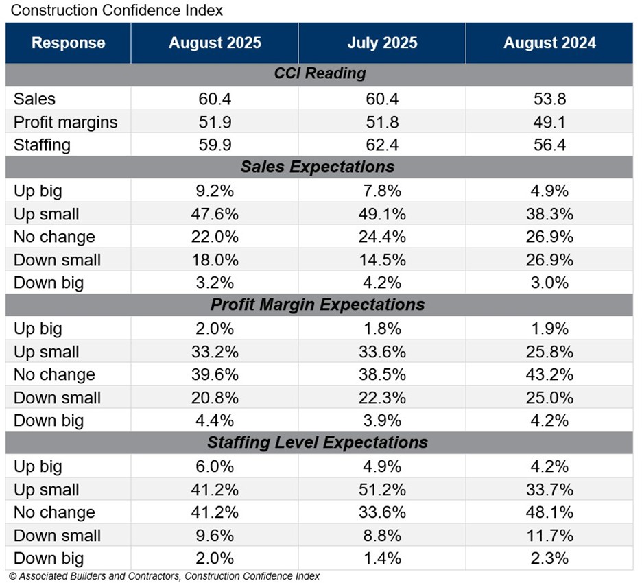 ABC’s Construction Confidence Index reading for sales was unchanged in August. The reading for staffing declined, while the reading for profit margins increased. The readings for all three components remain above the threshold of 50, indicating expectations for growth over the next six months.