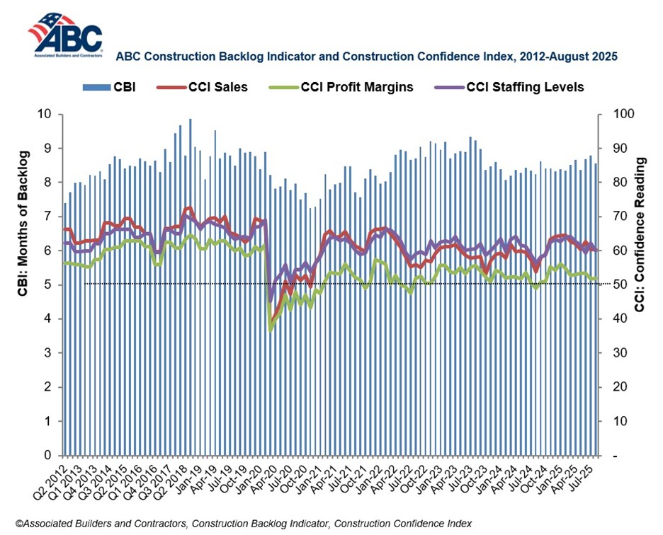 Associated Builders and Contractors reported that its Construction Backlog Indicator fell from 8.8 months in July to 8.5 months in August, according to an ABC member survey conducted Aug. 20 to Sept. 3. The reading is up 0.3 months since August 2024.