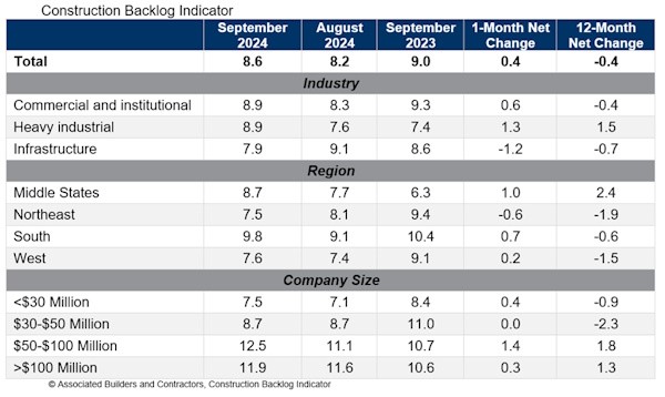 Associated Builders and Contractors reported that its Construction Backlog Indicator increased to 8.6 months in September, according to an ABC member survey conducted Sept. 20 to Oct. 4. The reading is down 0.4 months from September 2023.