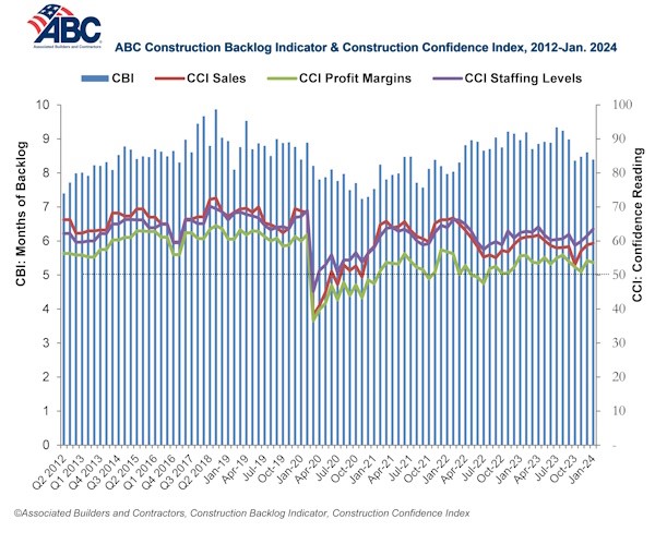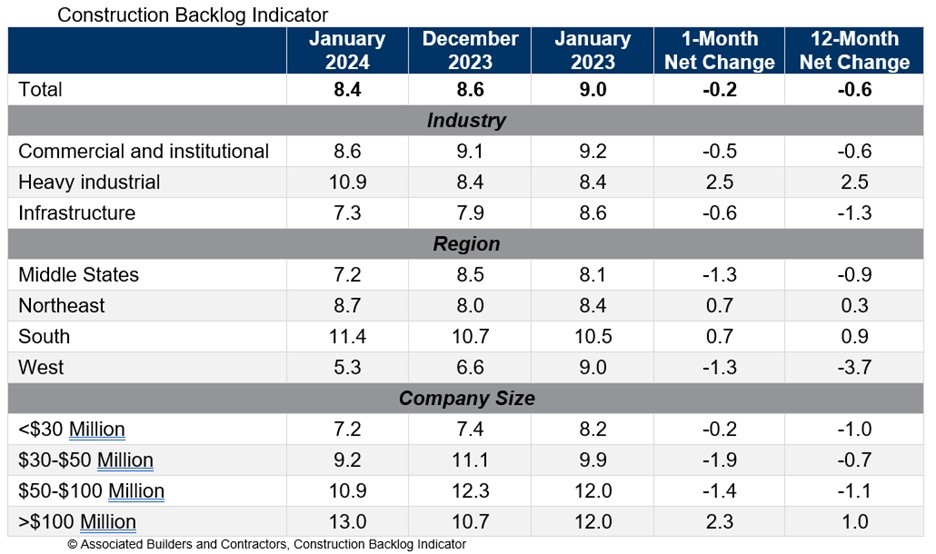 Associated Builders and Contractors’ Construction Backlog Indicator declined to 8.4 months in January, according to an ABC member survey conducted from Jan. 22 to Feb. 4. The reading is down 0.6 months from January 2023.